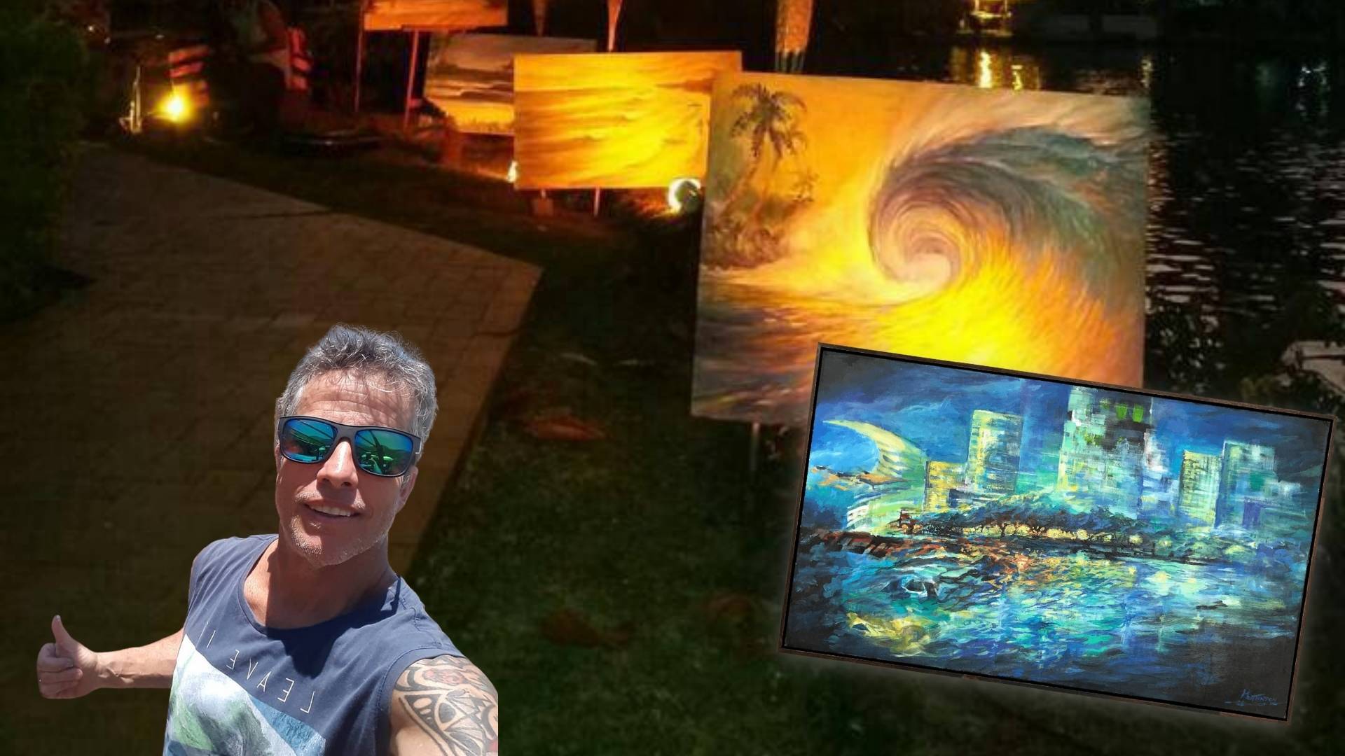 Pintou um grande painel de 3,60 x 1,00 sob encomenda do surfista profissional Carlos Burle.